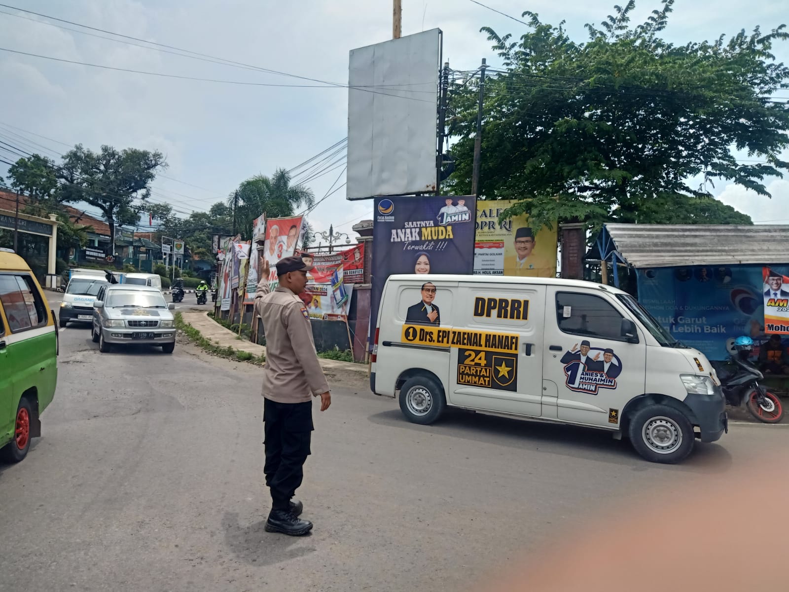 Polsek Cibatu Polres Garut melaksanakan pengamanan jalur kampanye rombongan DPD UMMAT di Kabupaten Garut. Senin pagi (15/01/2024).