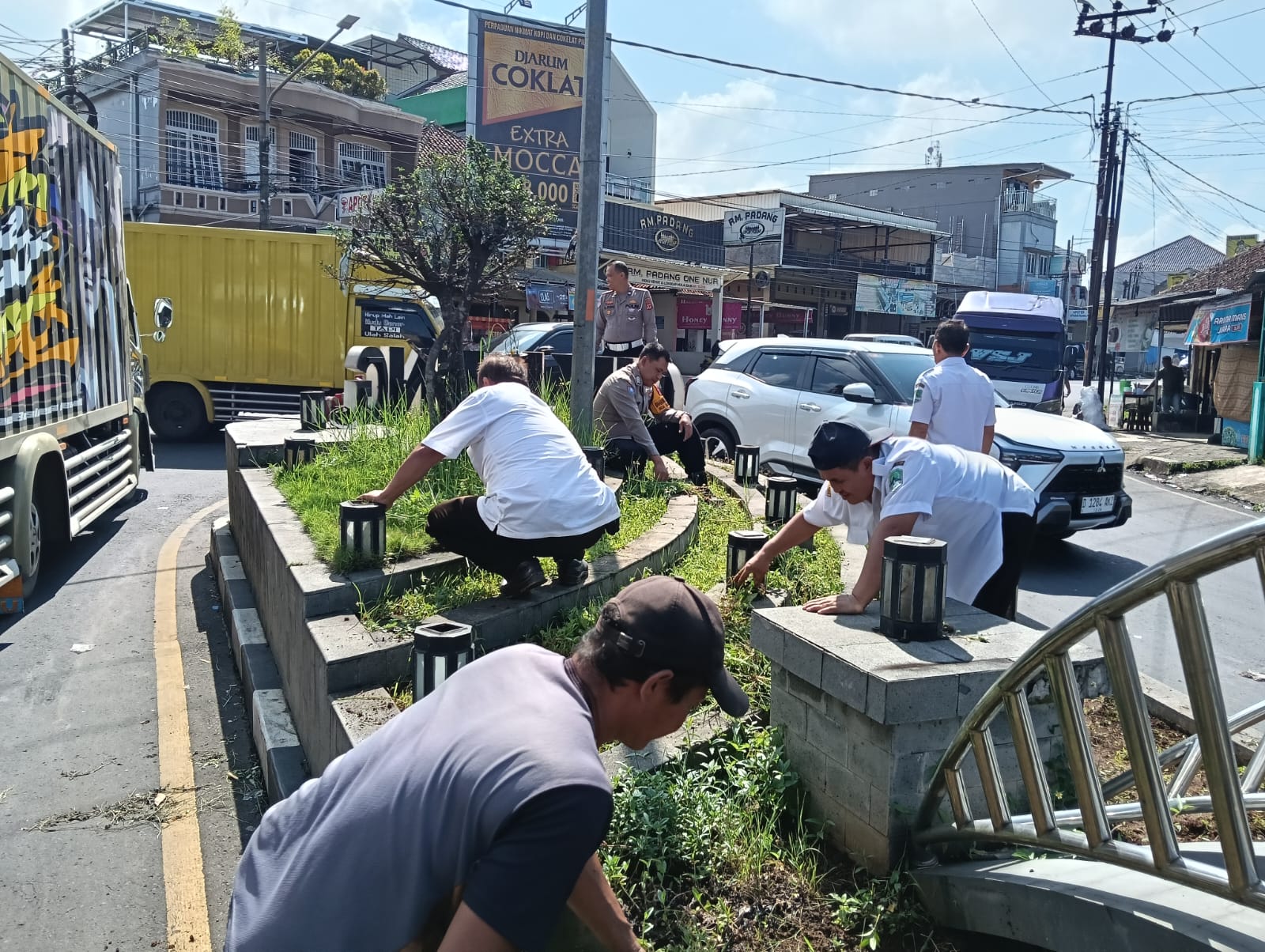 Polsek Cikijing Bersama Petugas Kecamatan Laksanakan Korve Bersihkan Taman Simpang Tiga Cikijing