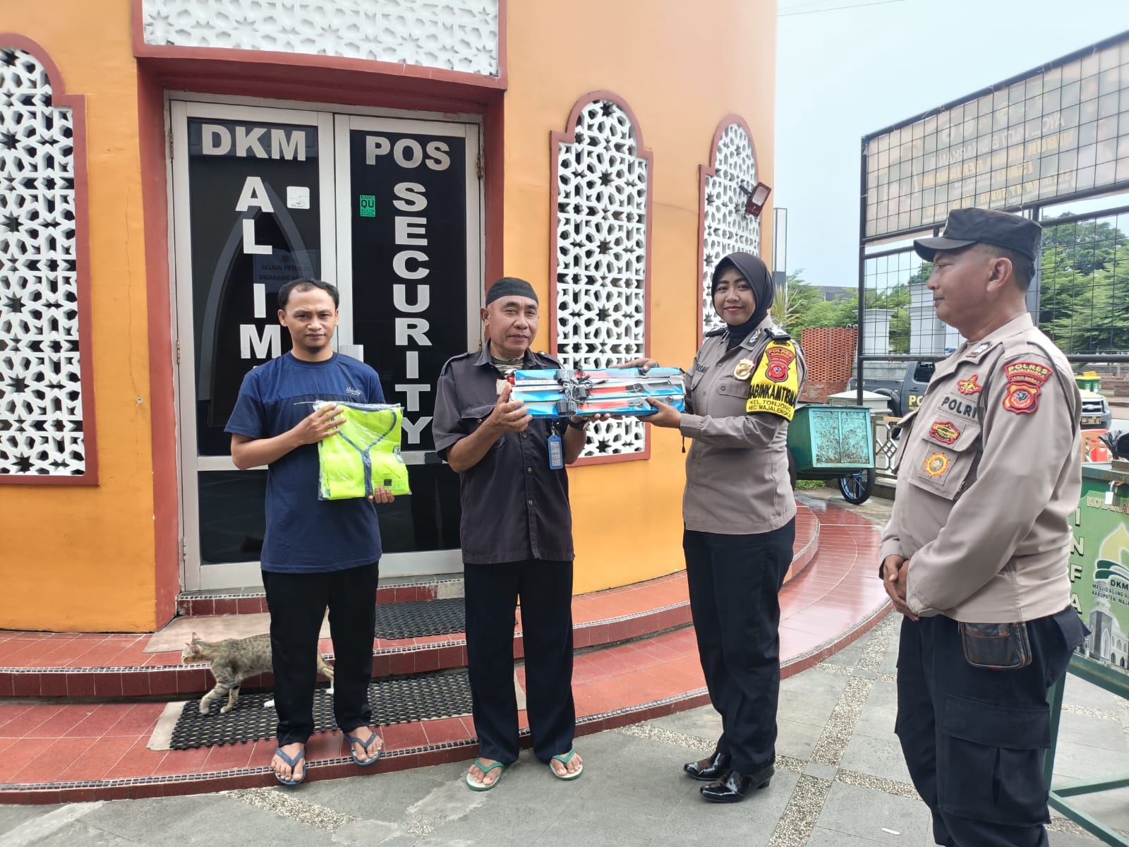 Dalam kegiatan tersebut, petugas menyerahkan dua buah rompi dan tiga buah lampu senter yang akan digunakan oleh security masjid dalam mendukung tugas pengamanan lingkungan dan kegiatan ibadah masyarakat.