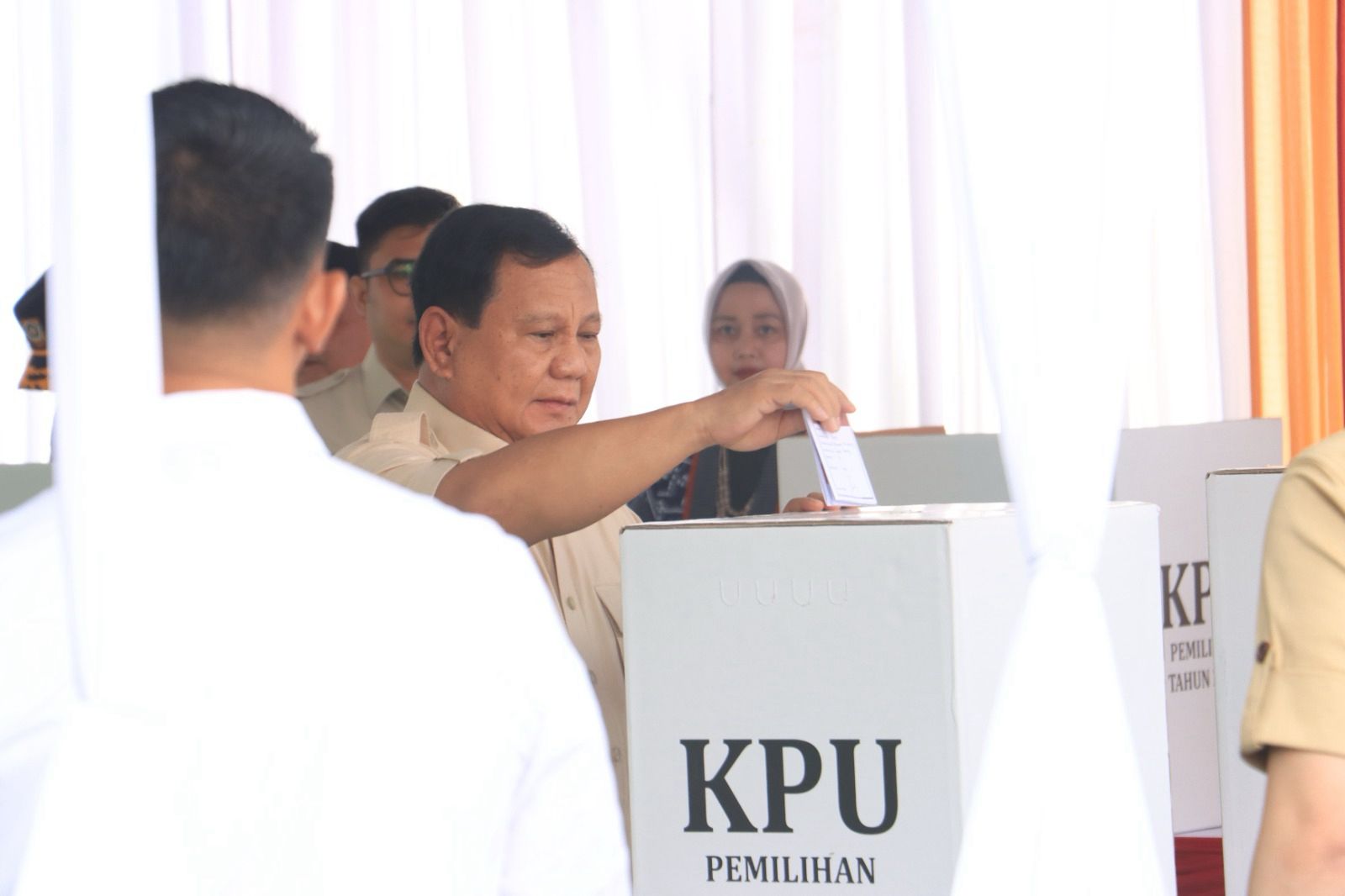 Presiden RI Prabowo Subianto tiba di TPS 08 Desa Bojong Koneng Kec. Babakan Madang Kab. Bogor dilanjutkan dengan pemungutan suara didampingi Pj. Bupati Bogor Dr. Ir. Bachrial Bakri M.App., SC dan Ketua DPRD Kab. Bogor Sastra Winara S.H.