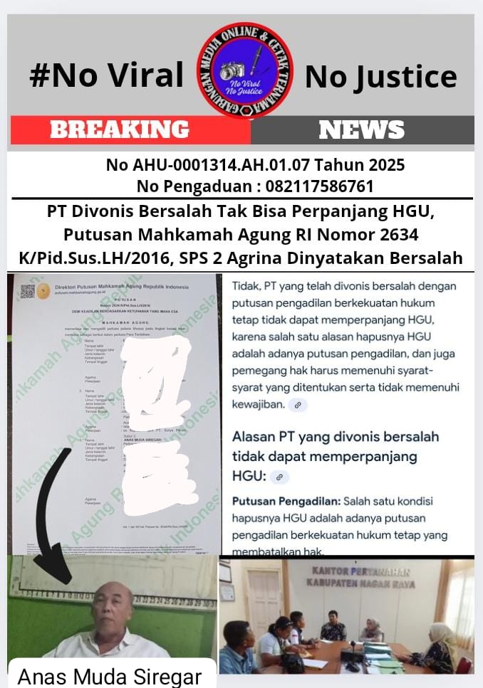 Eksposelensa.com – Nagan Raya, Aceh (GMOCT) 10 Oktober 2025 – Putusan Mahkamah Agung RI Nomor 2634 K/Pid.Sus.LH/2016 menjadi sorotan dalam sengketa lahan antara PT SPS 2 Agrina dengan warga Desa Babahlueng, Nagan Raya. Kasus ini kembali mencuat seiring dengan klaim PT SPS 2 Agrina yang masih mengklaim memiliki izin Hak Guna Usaha (HGU) di desa tersebut, meskipun perusahaan tersebut telah divonis bersalah berdasarkan putusan pengadilan yang berkekuatan hukum tetap.