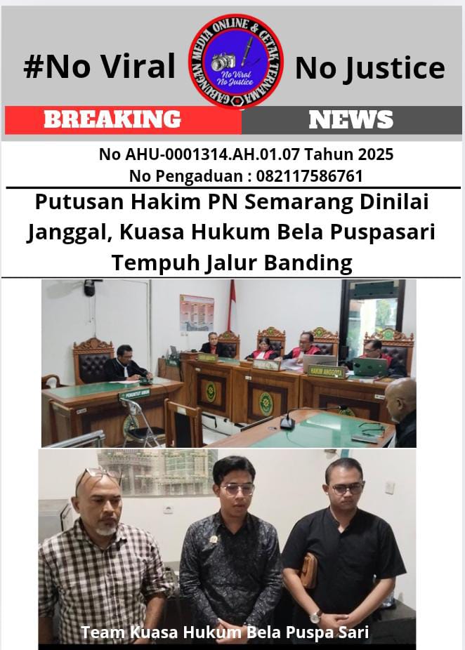 Eksposelensa.com – Semarang, 23 Mei 2025 (GMOCT) –  Putusan Pengadilan Negeri (PN) Semarang yang menjatuhkan hukuman 2,6 tahun penjara kepada Bela Puspasari atas kasus dugaan penggelapan dana di PT Terang Jaya Anugerah menuai kecaman keras dari kuasa hukumnya.  Mereka menilai putusan majelis hakim yang diketuai H. Muhammad Anshar Majid, dan beranggotakan Dame Parulian Pandiangan, S.H., dan Salman Alfaris, S.H.,  sarat kejanggalan dan kesalahan hukum.  Informasi ini diperoleh dari media online Jelajahperkara, anggota Gabungan Media Online dan Cetak Ternama (GMOCT).