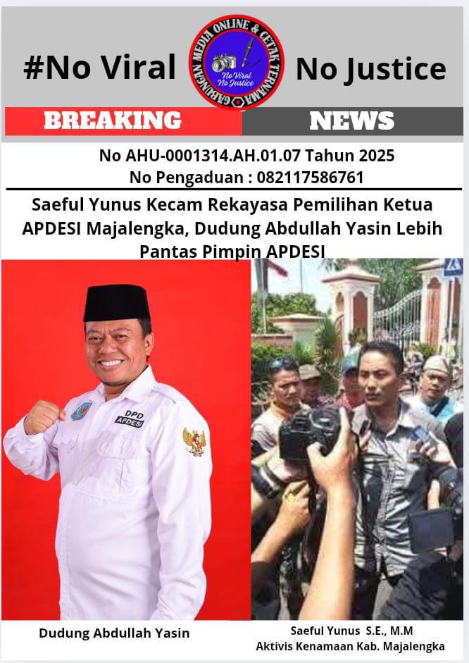 Eksposelensa.com – Majalengka, 11 Juni 2025 (GMOCT) – Saeful Yunus, S.E., M.M., mengutuk keras dugaan kuat rekayasa dan pengkondisian dalam pemilihan Ketua APDESI Kabupaten Majalengka. Ia menyoroti bahwa hanya ketua forum kepala desa dari 26 kecamatan yang diundang, dengan masing-masing hanya memiliki satu hak pilih.