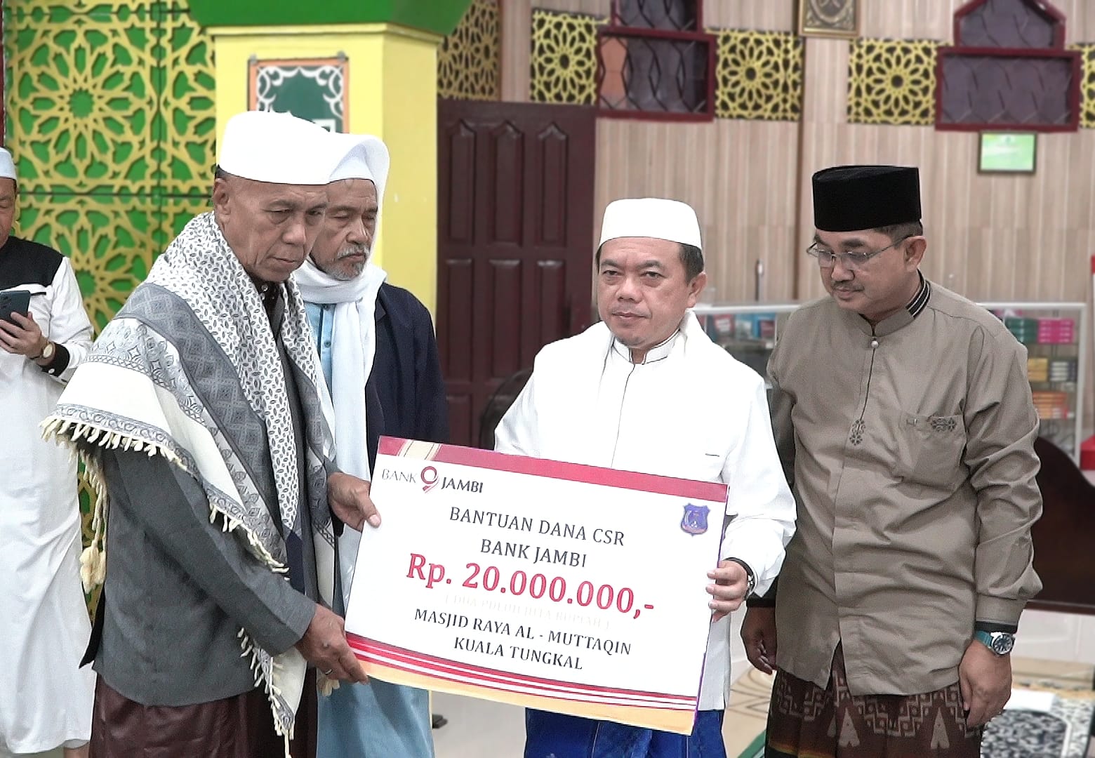 Selain melaksanakan sholat subuh berjama’ah, Gubernur Al Haris juga memberikan beberapa bantuan dan santunan, diantaranya memberikan bantuan pembangunan masjid, menyerahkan kunci bedah rumah dan sembako kepada pengurus Masjid Al-Muttaqin, bantuan kepada siswa-siswi serta santunan kepada anak-anak yatim piatu.