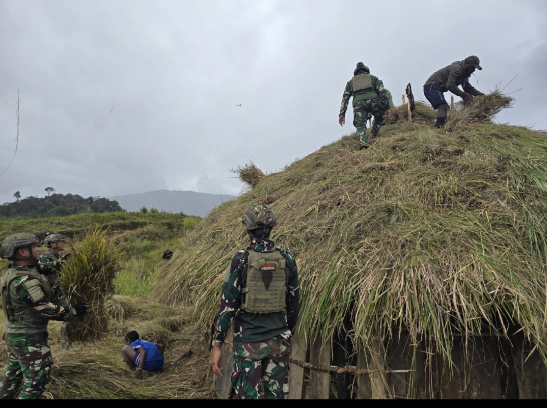 Di tengah rerumputan basah dan lembah yang senyap, terlihat prajurit loreng hijau bahu-membahu bersama warga. Mereka tak hanya menenteng senjata, tapi juga mengangkat rumpun alang-alang, naik ke atap, menyusun jerami, dan menata ulang kebesaran budaya Papua. Dipimpin oleh Sertu Ismail, para personel Satgas bergerak lincah, bukan dalam formasi tempur, tetapi dalam formasi kemanusiaan.
