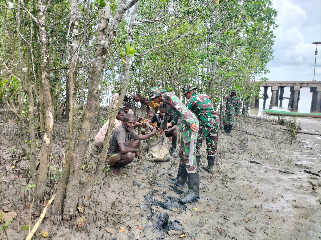 Eksposelensa.com | Merauke, -‘Karya bakti TNI melalui gotong royong dan kerja bakti dalam rangka susur sungai dengan membersihkan tumpukan sampah plastik dan ranting serta semak belukar dilakukan di Kampung Kiworo, Distrik Kimaam, Kabupaten Merauke, Papua Selatan, Senin (8/01/2024).