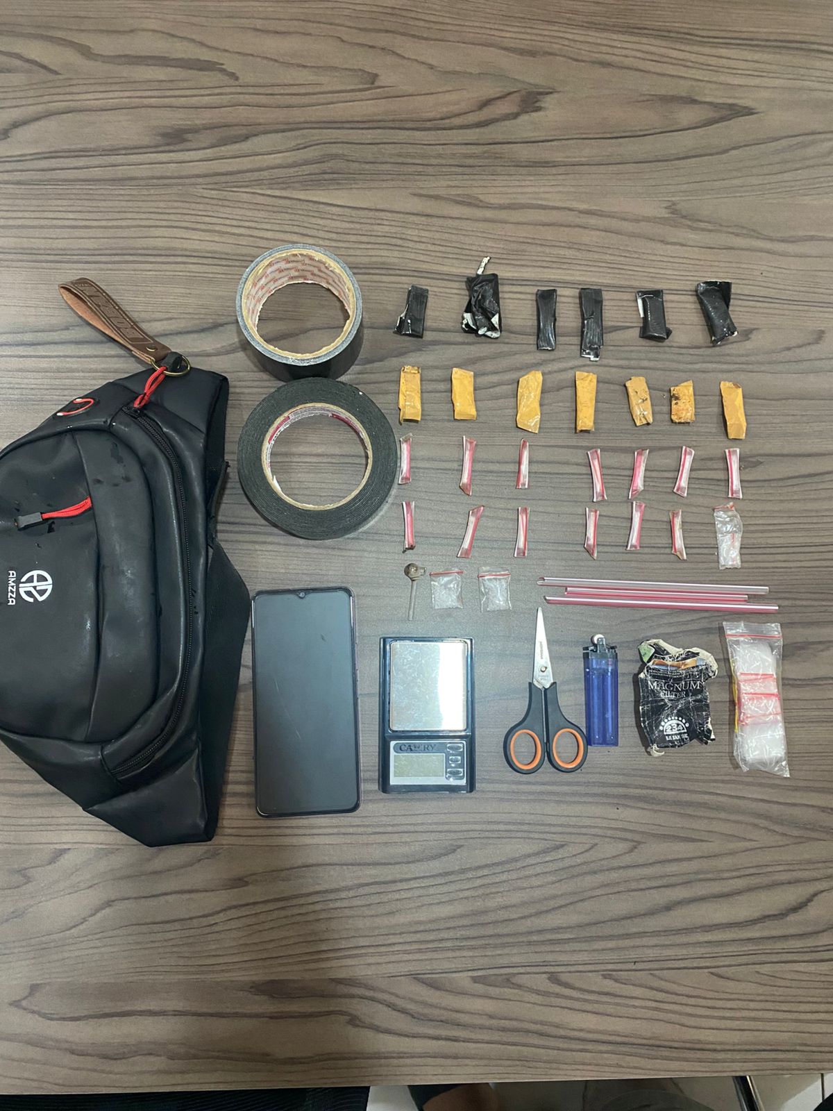 Dari tangan pelaku, polisi menyita sejumlah barang bukti berupa 6 paket sabu dalam plastik klip bening dibalut tisu putih dan lakban hitam, 7 paket sabu dalam plastik klip bening dibalut kertas putih dan lakban cokelat, 2 paket sabu dalam plastik klip bening, 13 paket sabu dalam plastik klip bening yang dimasukkan ke dalam sedotan bening, 1 paket sabu dalam plastik klip bening yang dimasukkan ke dalam bungkus rokok merk Magnum hitam.