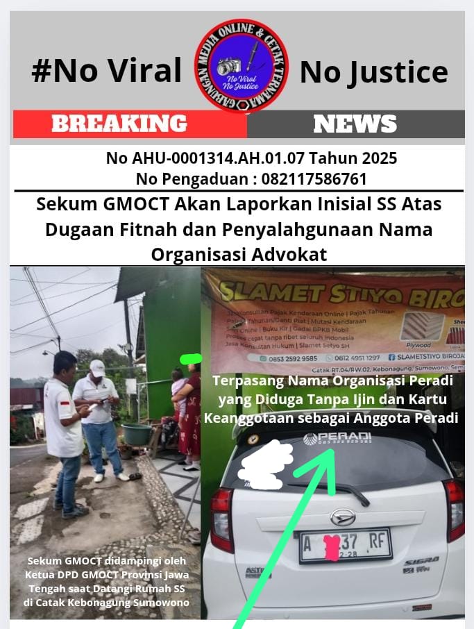 Eksposelensa.com – Kabupaten Semarang (GMOCT) – Sekretaris Umum Gabungan Media Online dan Cetak Ternama (GMOCT), Asep NS, berencana melaporkan seorang warga Sumowono berinisial SS atas dugaan fitnah dan penyalahgunaan nama organisasi advokat. Kasus ini bermula saat GMOCT tengah mengawal pemberitaan terkait seorang Ketua RT09 a n Murdianto di Kota Semarang yang mana sang ketua RT tersebut sedang dibantu/dikawal oleh Pemuda Batak Bersatu (PBB).