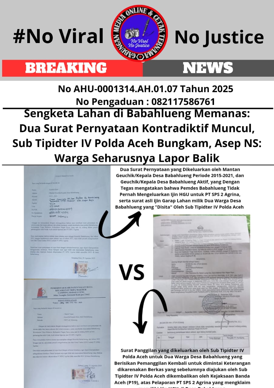 Sengketa Lahan di Babahlueng Memanas: Dua Surat Pernyataan Kontradiktif Muncul, Sub Tipidter IV Polda Aceh Bungkam, Asep NS : Warga Seharusnya Lapor Balik