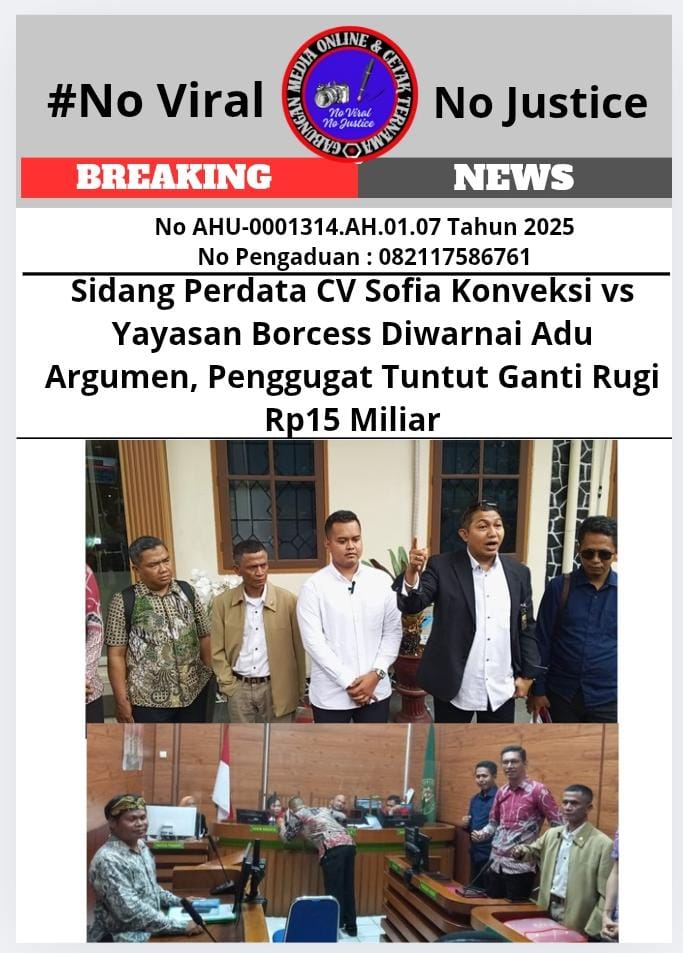Dalam perkara perdata ini, CV Sofia Konveksi menuntut ganti rugi sebesar Rp15 miliar atas kerugian materiel dan immateriel yang diklaim timbul akibat persoalan bisnis dan dugaan pelanggaran lain oleh pihak Yayasan Borcess.