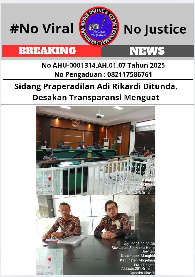 Eksposelensa.com – Mungkid, Magelang (GMOCT) – Sidang praperadilan antara Adi Rikardi melawan Polresta Magelang yang digelar di Pengadilan Negeri (PN) Mungkid pada Kamis, 1 Agustus 2025, pukul 09.00 WIB, berakhir tanpa putusan. Agenda penyerahan dan pembacaan kesimpulan dari kedua belah pihak telah dilakukan, namun putusan akhir ditunda hingga Selasa, 5 Agustus 2025, pukul 10.00 WIB. Penundaan ini menimbulkan beragam reaksi, terutama dari para pendukung Adi Rikardi yang mayoritas adalah para sopir truk.