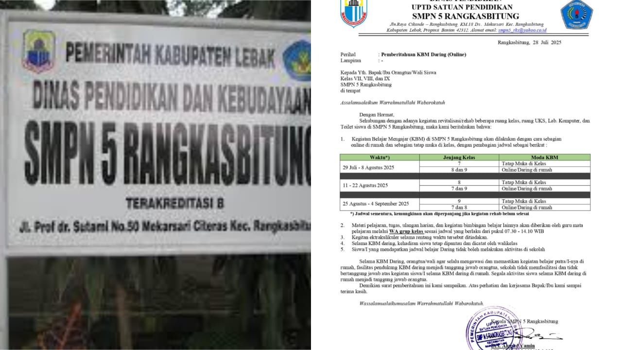 Eksposelensa.com – Lebak – SMPN 5 Rangkasbitung mulai menerapkan sistem pembelajaran daring (online) secara bergilir untuk siswa kelas VII, VIII, dan IX mulai 29 Juli hingga 4 September 2025. Kebijakan ini diterapkan seiring dengan pelaksanaan proyek revitalisasi fisik di lingkungan sekolah.