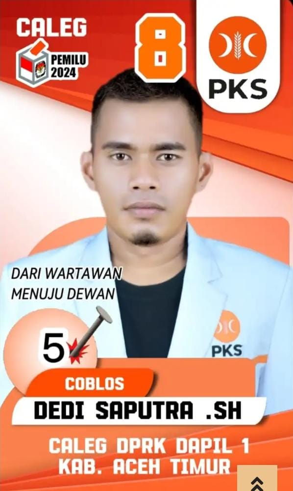 Salah satu diantara ratusan para Caleg yang akan mengikuti Kontestasi pada Pileg 2024 mendatang adalah Dedi Saputra SH, pria kelahiran tahun 1988 asal Desa Gampong jawa, Kecamatan Idi Rayeuk anak pasangan dari almarhum Azhar (Wak Maun) dan (Nur Azizah) ini yang berprofesi sebagai wartawan media elektronik itu mendaftarkan diri sebagai Caleg dari Partai Keadilan Sejahtera (PKS) asal Dapil 1 yang meliputi enam (6) Kecamatan yaitu :