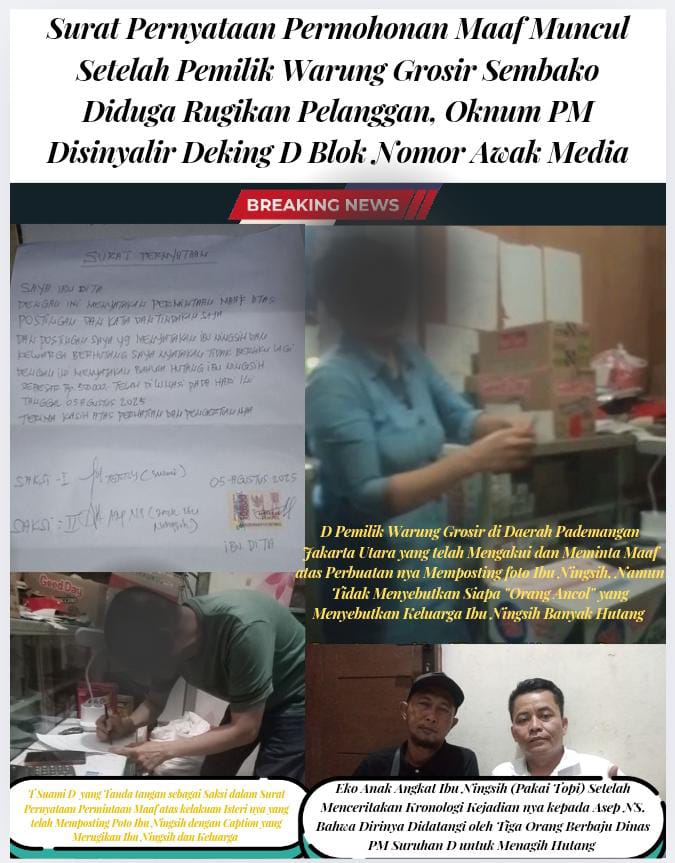 Eksposelensa.com – Jakarta Utara, 7 Agustus 2025 – Sebuah surat pernyataan permohonan maaf muncul setelah seorang pemilik warung grosir sembako berinisial D diduga melakukan tindakan yang merugikan salah satu pelanggannya, Ibu Ningsih. Kejadian ini bermula ketika D membuat story WhatsApp yang memposting foto Ibu Ningsih bersama cucunya tanpa izin, disertai caption yang dianggap sangat merugikan korban dan keluarganya. Hal ini dipicu oleh keterlambatan pembayaran sisa belanja sebesar Rp 500.000. surat tersebut dibuat tanggal 5 Agustus 2025 di warung milik D dan T.