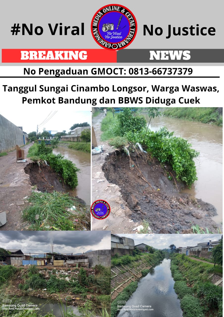 Eksposelensa.com – Bandung, Jawa Barat – Gabungan Media Online dan Cetak Ternama (GMOCT), mengutip laporan Matainvestigasi.com, menyoroti kondisi tanggul Sungai Cinambo di Gedebage Selatan yang longsor dan membahayakan warga sekitar. Kondisi ini dinilai semakin memprihatinkan karena diduga diabaikan oleh Pemerintah Kota Bandung dan Balai Besar Wilayah Sungai (BBWS).