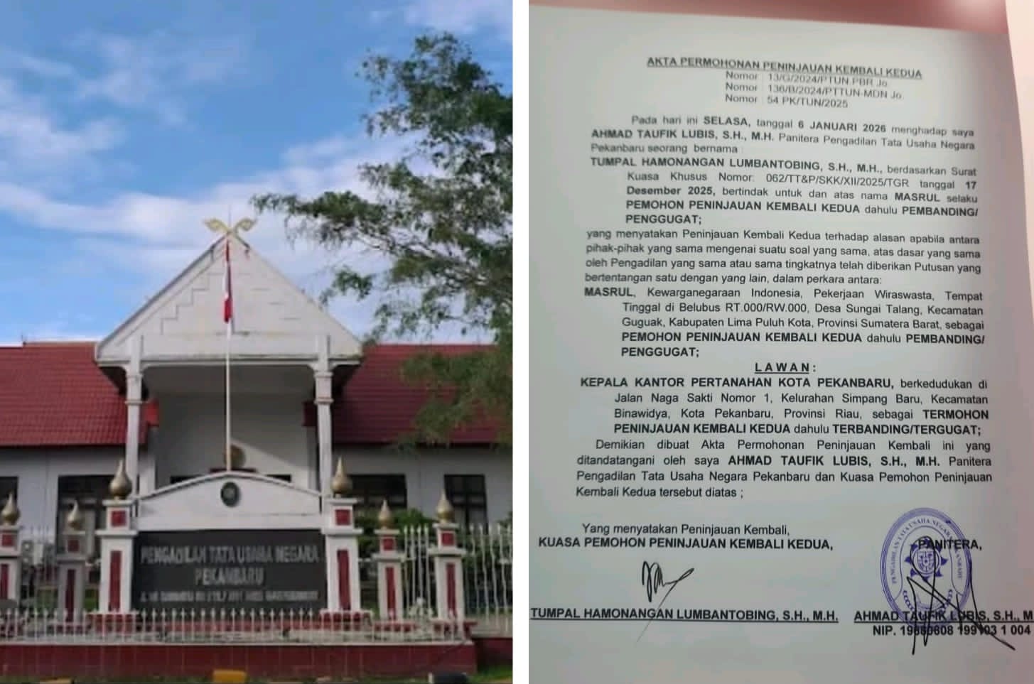Eksposelensa.com – Pekanbaru– Terkait Permasalahan Kasus/ konflik lahan H. Masrul yang berada di Jalan Arifin Ahmad, Kota Pekanbaru, dengan PT. Handala Mandala Sampoerna dan BPN Kota Pekanbaru, saat ini tengah bergulir, memasuki Proses Peninjauan Kembali Kedua. (6/1/2026).