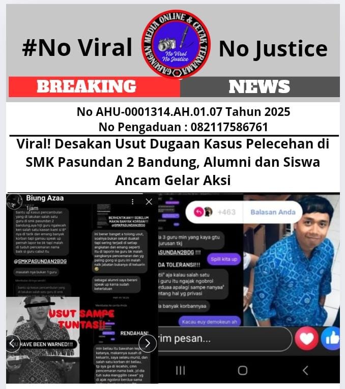 Eksposelensa.com – Bandung (GMOCT) – Polemik serius mencuat di lingkungan SMK Pasundan 2 Bandung setelah muncul dugaan kasus pelecehan yang menyeret oknum guru di sekolah tersebut. Isu ini ramai diperbincangkan melalui media sosial, di mana sejumlah akun menuliskan kesaksian bahwa kasus dugaan pelecehan bukanlah peristiwa tunggal, melainkan diduga terjadi berulang kali di setiap angkatan. Informasi ini, yang awalnya beredar luas, kemudian dihimpun oleh Gabungan Media Online dan Cetak Ternama (GMOCT) melalui laporan dari media online Mediasaksi, salah satu anggota GMOCT.