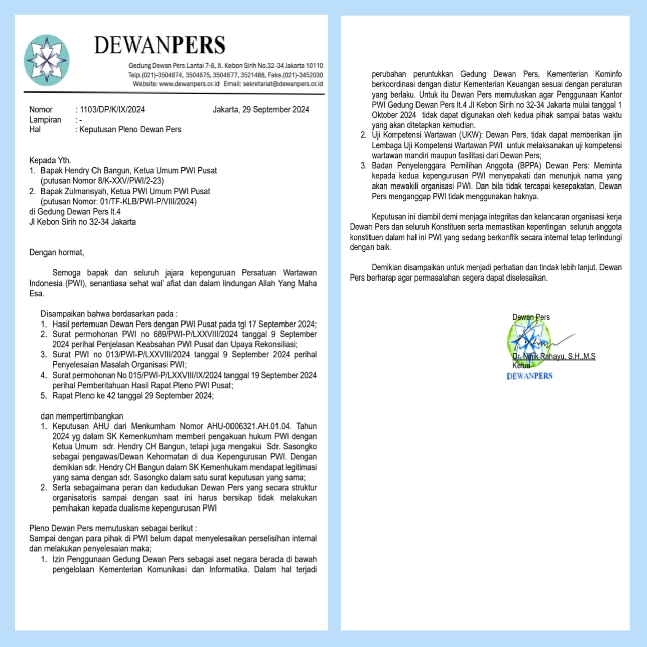Nomor : 1103/DP/K/IX/2024 Jakarta, 29 September 2024 Lampiran : – Hal : Keputusan Pleno Dewan Pers Kepada Yth. 1. Bapak Hendry Ch Bangun, Ketua Umum PWI Pusat (putusan Nomor 8/K-XXV/PWI/2-23) 2. Bapak Zulmansyah, Ketua PWI Umum PWI Pusat (putusan Nomor: 01/TF-KLB/PWI-P/VIII/2024) di Gedung Dewan Pers lt.4 Jl Kebon Sirih no 32-34 Jakarta Dengan hormat, Semoga bapak dan seluruh jajara kepenguruan Persatuan Wartawan Indonesia (PWI), senantiasa sehat wal’ afiat dan dalam lindungan Allah Yang Maha Esa. Disampaikan bahwa berdasarkan pada :