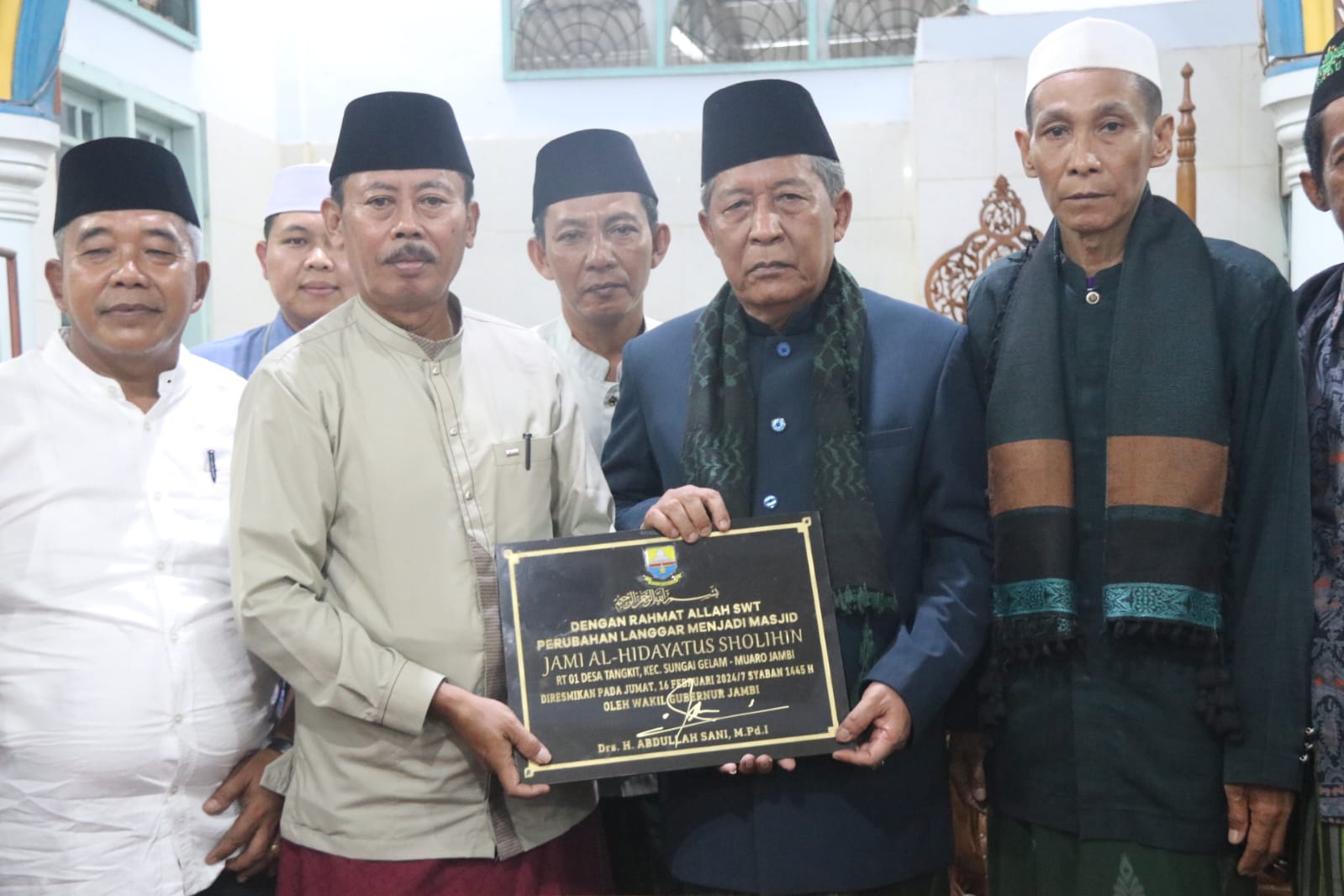 “Alhamdulillah pada malam hari ini kita meresmikan perubahan status langgar mejadi Masjid Jami’ Al Hidayatussholihin Kebun Kolim Desa Tangkit Kecamatan Sungai Gelam, semoga kedepan selalu istiqomah dalam mengisi masjid ini,” ujar Wagub Sani.