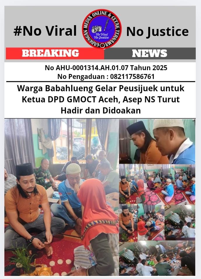 Nagan Raya – Selasa, 8 Oktober 2025. Suasana haru dan khidmat terasa di kediaman Ridwan, Ketua DPD Gabungan Media Online dan Cetak Ternama (GMOCT) Provinsi Aceh, di Desa Seumanyam Serbaguna, Kecamatan Darul Makmur. Warga Gampong Babahlueng bersama tokoh masyarakat menggelar upacara adat Peusijuek sebagai wujud doa keselamatan dan dukungan moral kepada Ridwan yang menjadi korban pembacokan oleh pelaku bernama Muslem.