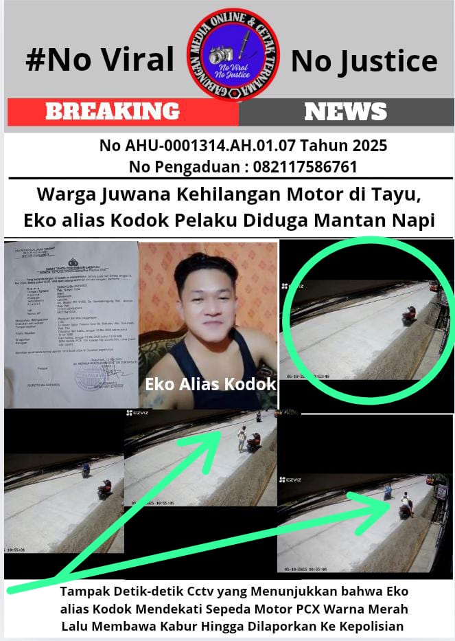 Eksposelensa.com – Pati, Jawa Tengah (GMOCT) – Team liputan khusus GMOCT Gabungan Media Online dan Cetak Ternama melalui Wakil Sekertaris Umum GMOCT Cahyo Purnomo menerima laporan perihal Dugaan kasus pencurian sepeda motor terjadi di Desa Bakalan, Kecamatan Dukuhseti, Tayu, Pati. Korban, Suroto, warga Mbatur desa Sembaturagung Jakenan Pati, kehilangan sepeda motor Honda PCX merahnya pada Sabtu, 10 Mei 2025 sekitar pukul 11.00 WIB. Kejadian bermula saat Suroto hendak melakukan ketemuan mau di kasih handphone di Tayu sama di duga pelaku. Ia bertemu dengan Eko alias Kodok, warga Bulungan Tayu, yang dikenal sebagai mantan narapidana kasus pencurian sepeda motor.