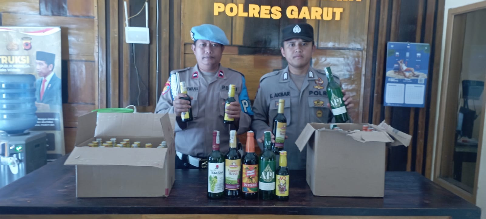 Polsek Singajaya Polres Garut mengamankan barang bukti berupa 22 botol jenis arak kecil, 5 botol besar anggur merah, 5 botol besar intisari, 2 botol besar anggur hijau/apl dan 1 botol jenis kawa-kawa yang disita dari warung minuman tersebut.